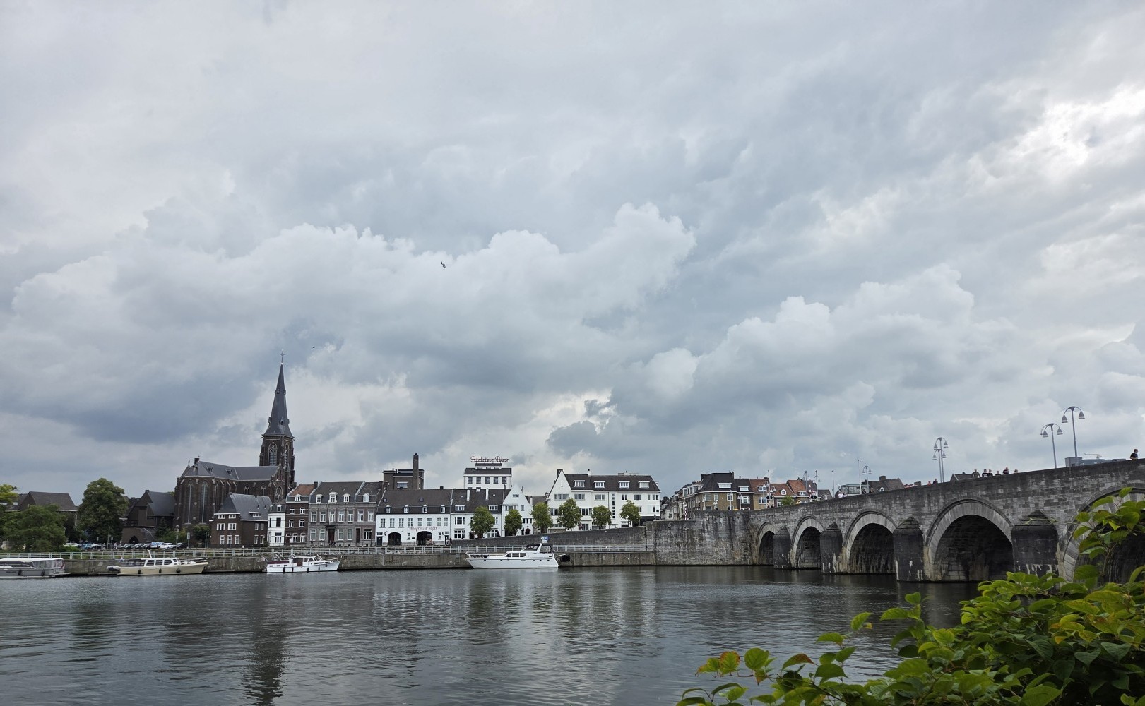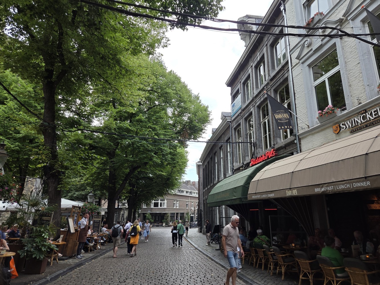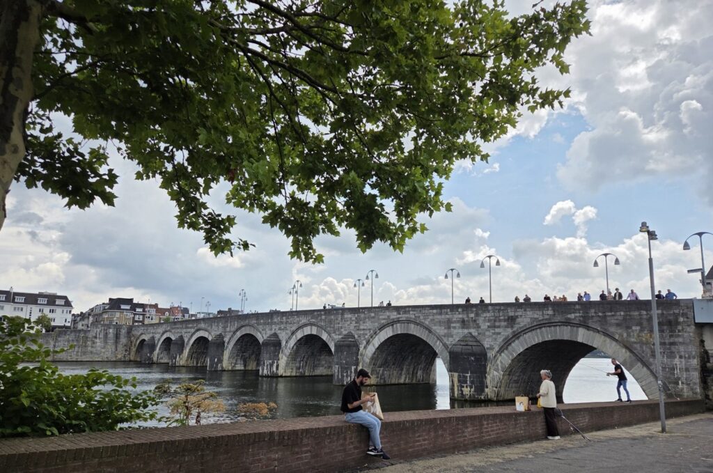 Maastricht was gorgeous and really interesting right from its beautifully vintage train station. The main walk into town took us past a sandwich shop Tharash wanted to try, so we got sandwiches. They were popular and busy! I was not really a fan of the sandwich once I got to eat it though, I picked artichoke tapenade which sounds great but I wasn’t really thrilled by the execution and also it had tons of arugula again. Maybe I just don’t like artichoke tapenade. Tharash liked his well enough. Anyway we crossed the historic-looking bridge and went to go sit by the river to eat our sandwiches. There was a guy fishing, and drew a crowd to watch him when he hooked something. I decided not to gawk, so… I missed seeing the fish. : P