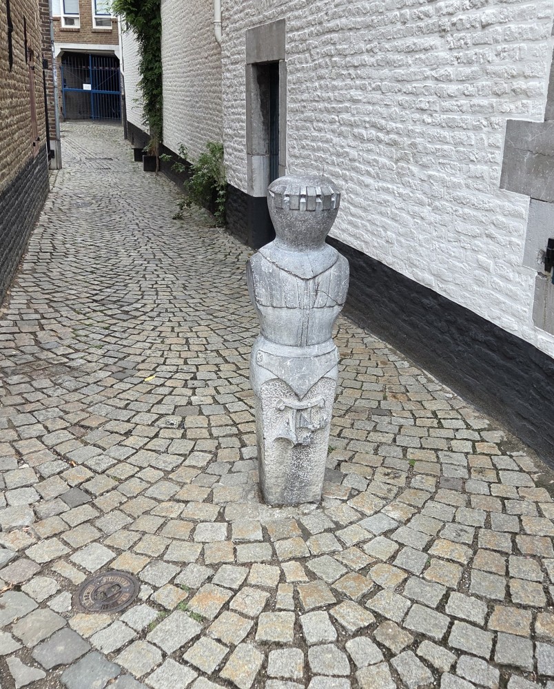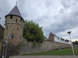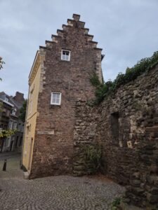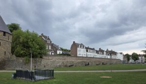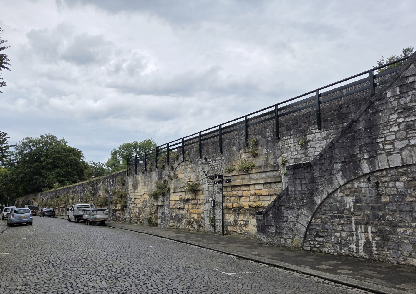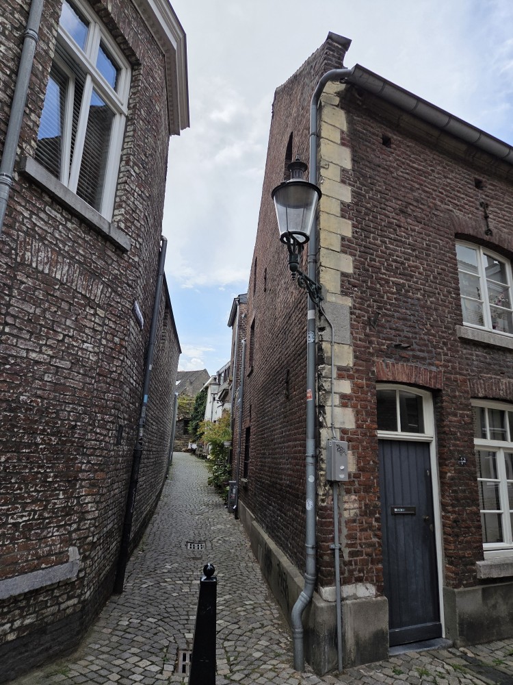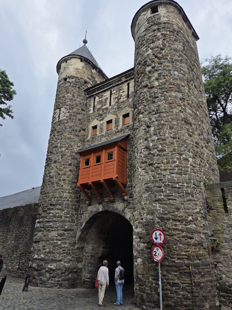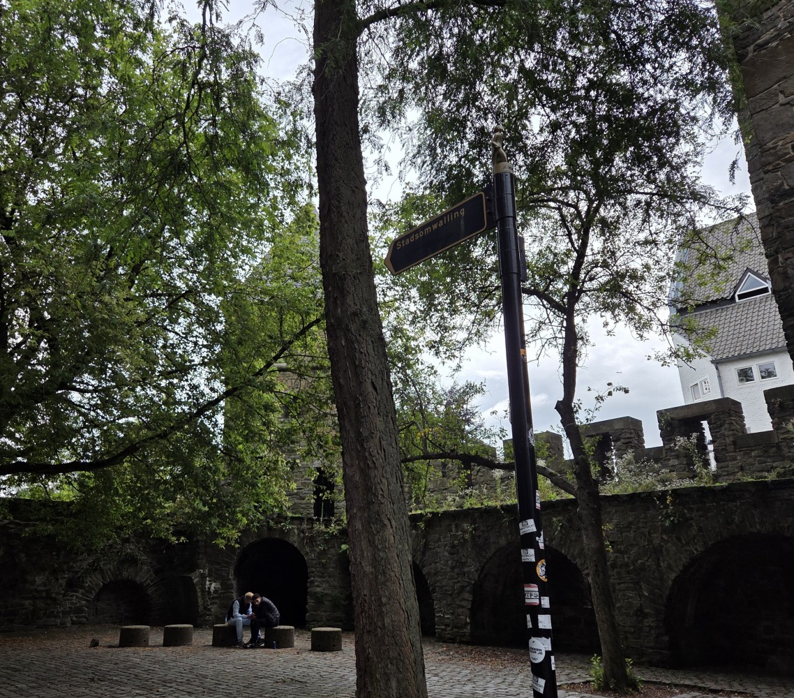 On the end of the wall is a sign that says (in Dutch) “After the people of Maastricht received the right to fortify their city from Duke Hendrik I of Brabant in 1229, an earthen defensive wall was built around the city. The first city wall on this wall, made of dark brown coal sandstone, was built in the second quarter of the 13th century. This defensive wall originally had a rampart walk and small towers. The bluestone gate surround dates from the first half of the 16th century.”