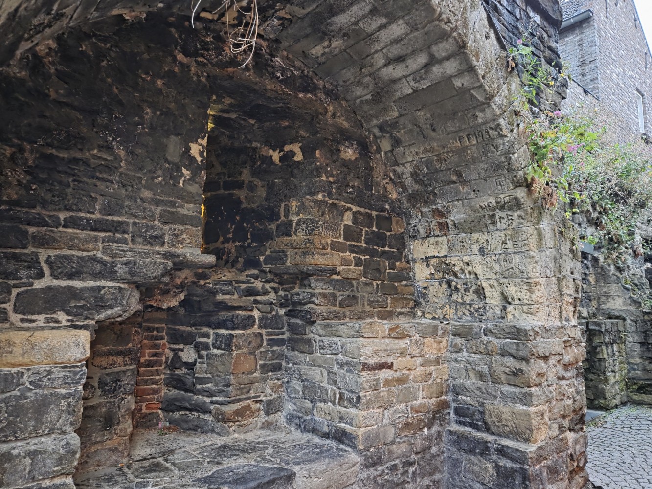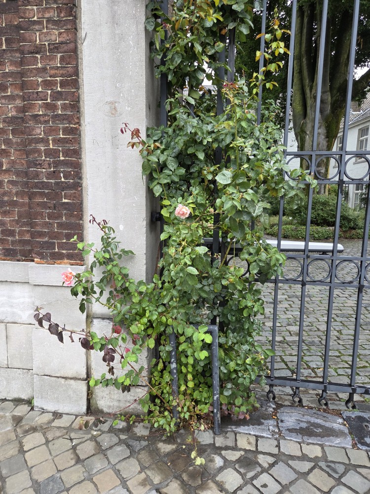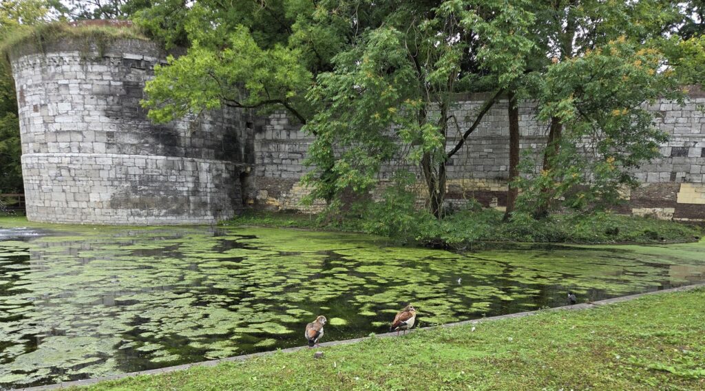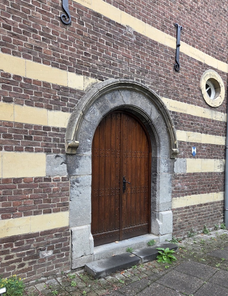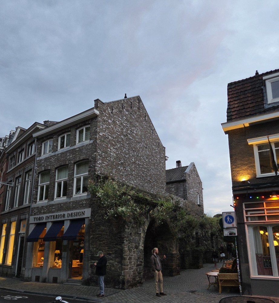 On the end of the wall is a sign that says (in Dutch) “After the people of Maastricht received the right to fortify their city from Duke Hendrik I of Brabant in 1229, an earthen defensive wall was built around the city. The first city wall on this wall, made of dark brown coal sandstone, was built in the second quarter of the 13th century. This defensive wall originally had a rampart walk and small towers. The bluestone gate surround dates from the first half of the 16th century.”