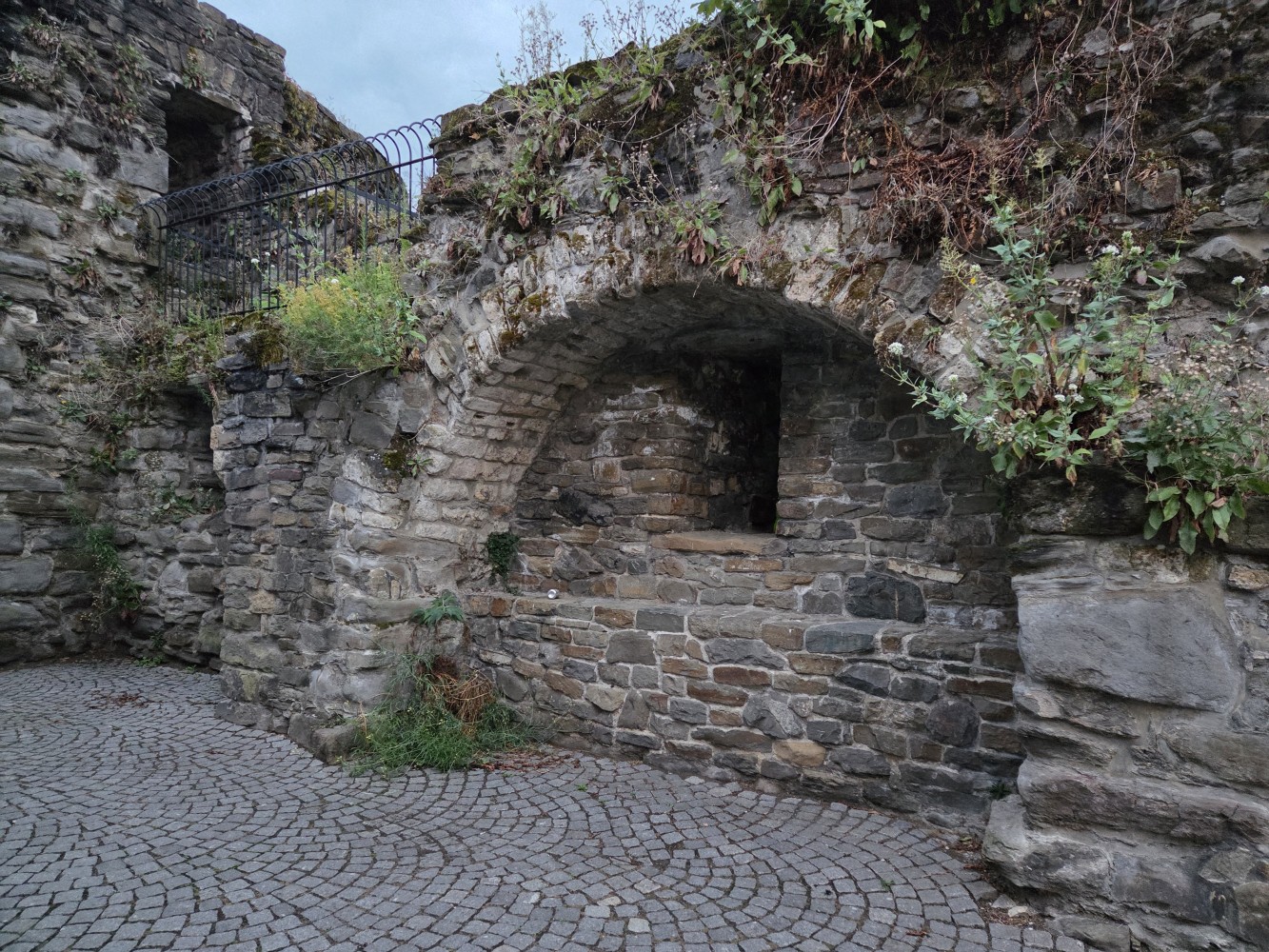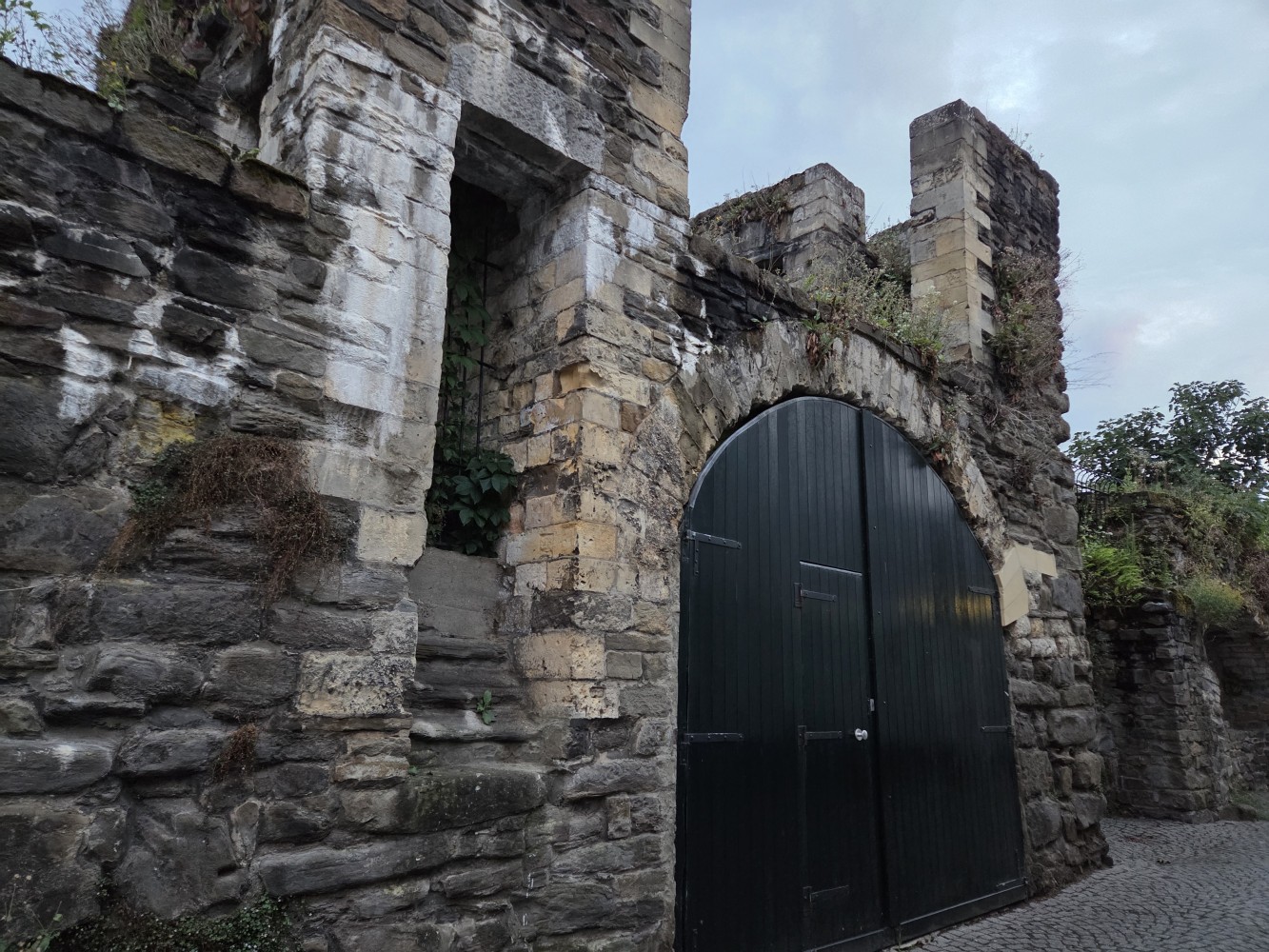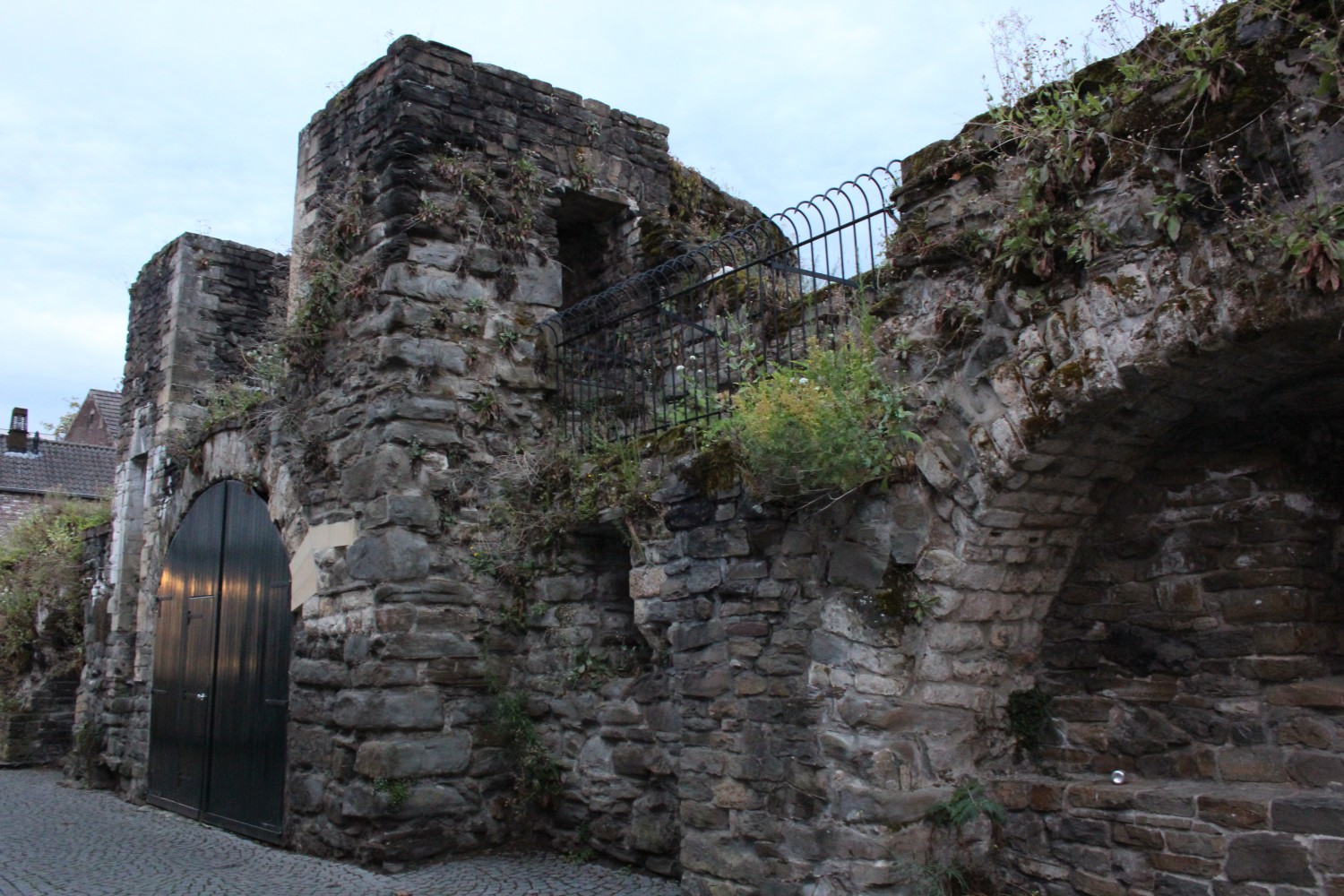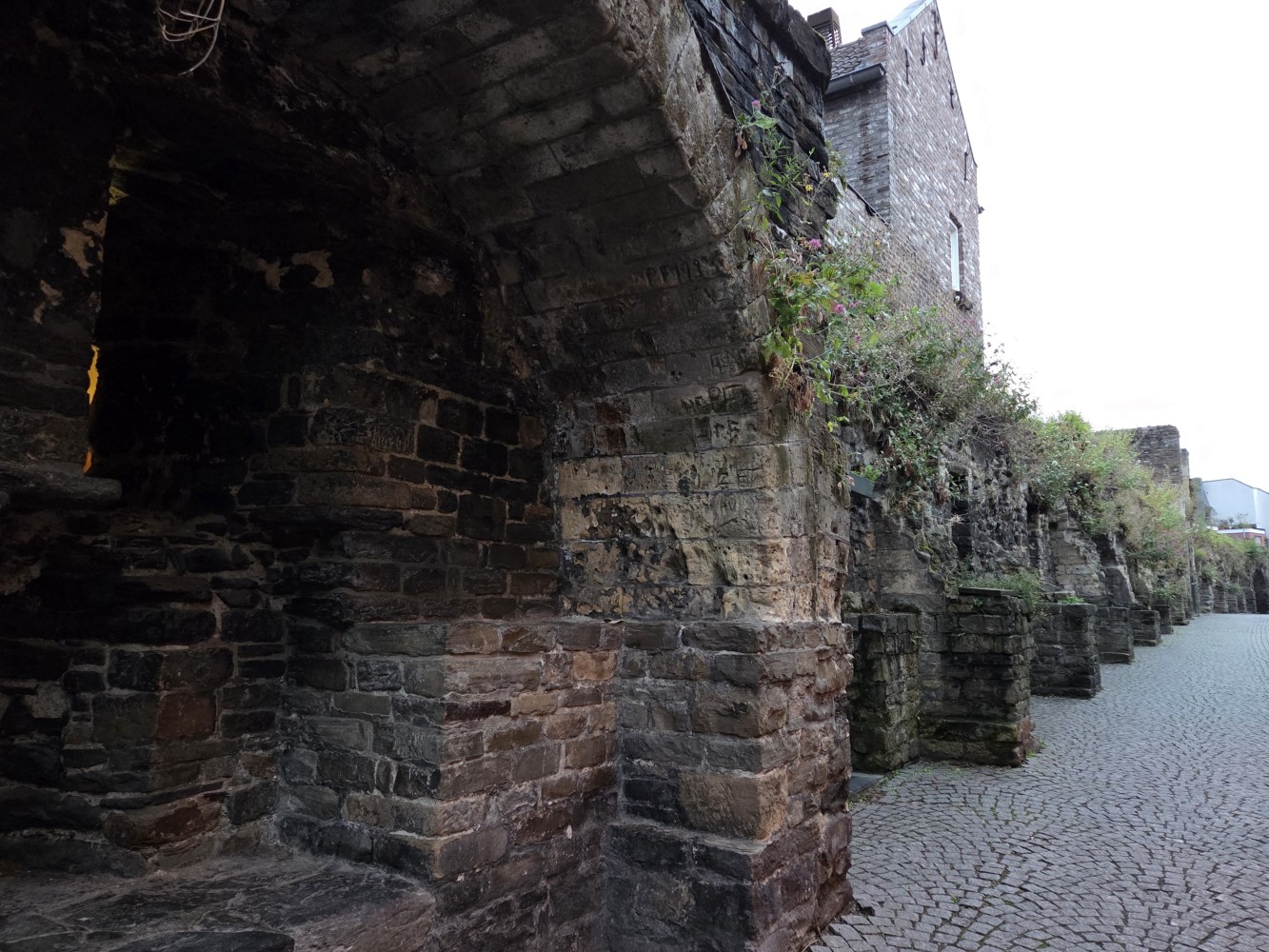 On the end of the wall is a sign that says (in Dutch) “After the people of Maastricht received the right to fortify their city from Duke Hendrik I of Brabant in 1229, an earthen defensive wall was built around the city. The first city wall on this wall, made of dark brown coal sandstone, was built in the second quarter of the 13th century. This defensive wall originally had a rampart walk and small towers. The bluestone gate surround dates from the first half of the 16th century.”