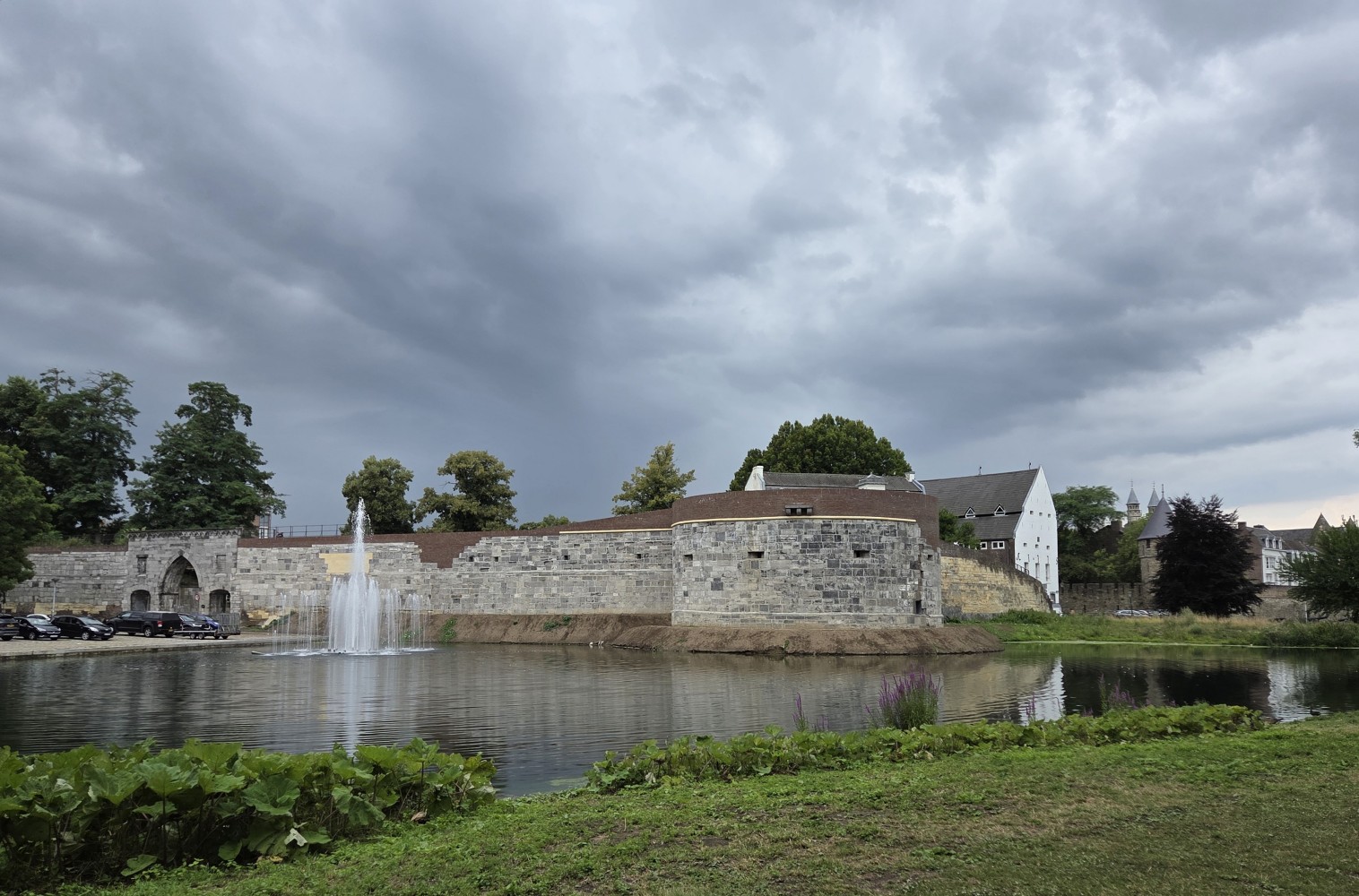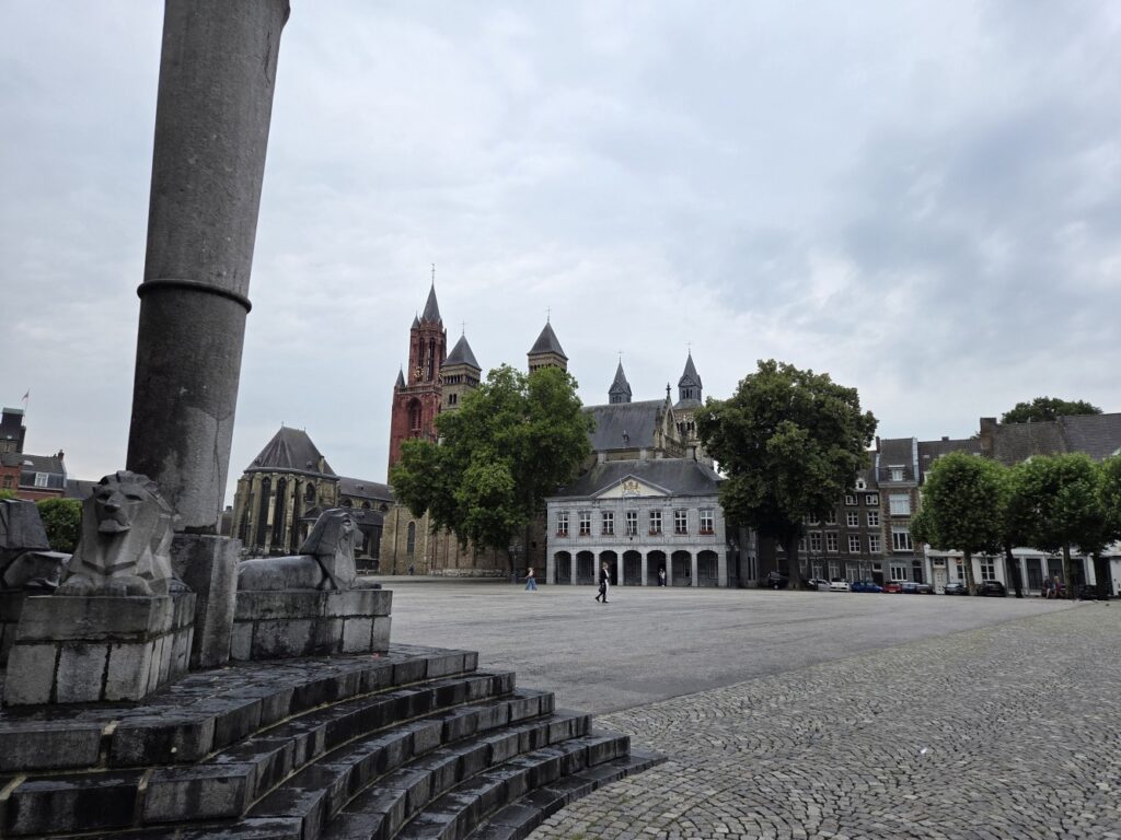 Vrijthof, a square showing a water fountain in the foreground, and small historic military building, backed by the Basilica of St. Servatius (brown towers) and the Church of St. Jan (red tower)