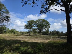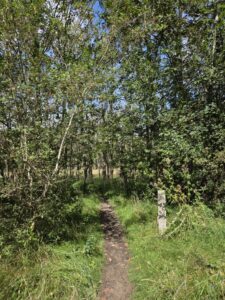 The terrain changed extremely rapidly, and no two places looked like each other. There were thick woods, and spindly thin woods, and grasslands, and sandy parts, and thick bushes, and the hiking trail went right through the middle of all of them. It runs parallel to the biking trail, but half the time you can’t see the biking trail at all due to trees or bushes. In some places the undergrowth and grasses are so thick it’s like wading waist-deep. And yet there are people who go jogging through it. One of them passed us (not in the wading part, fortunately).