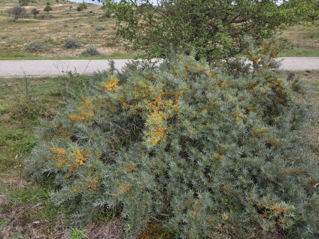 A sea buckthorn laden with berries. We saw lots of these too, some bushes bearing more than others, and I remembered the jam I tried from Finland – iirc, they’re pretty tart.
