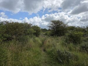 On the other side of the beach dune I ate the other half of my bun. And then we headed back, a bit more directly to try and make it to a facility that might be able to offer us a proper band-aid, though I got super lost at the end.