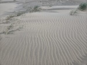 The sand catches on the plants and builds up behind them, while it’s blown away from in between them.