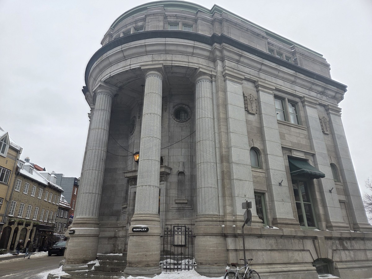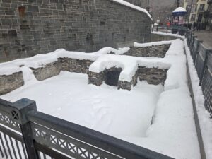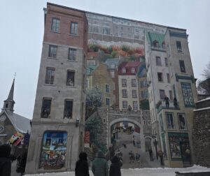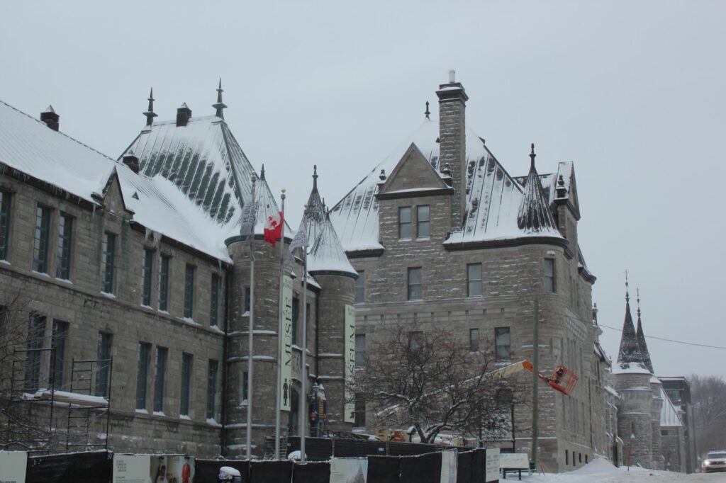 The middle floor had an art exhibit on Benedict Arnold’s failed attempt to attack Quebec City; they gave us an iPad with headphones, on which there were audio/video files of a lady narrating in the voice of a real historical person. To go along with that were six artworks that were… vaguely connected to the story, divided as it was into six segments for presentation. Some of them were kind of out there. Sometimes it’s nice to have the artist’s thoughts on what their piece means, to give a deeper understanding of what it’s about, some extra nuance, but when you need the artist’s walkthrough to even understand the art at all I’m not sure it has succeeded as art. There were also two mosaics based on real paintings from the 19th century that were quite nice, I liked how one of them used ceramic fragments and pearls to depict blowing snow and snowdrifts, but… it’s basically fanart. Just show us the original paintings.