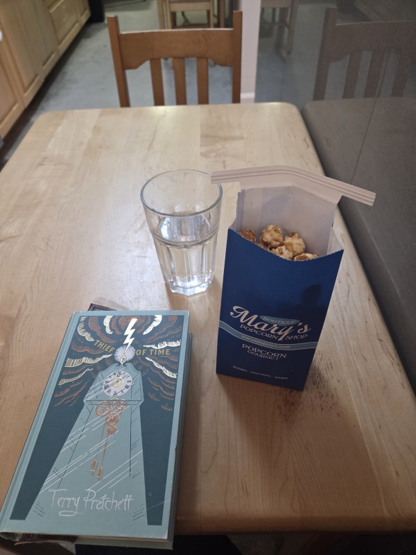 Tharash went out to do an audio tour like we had done in Montreal, but the wind was SUPER cold and miserable, with snow, and halfway he stopped at a café to get a subpar “chai” latte that was mostly milk. I stayed in bed and tried to rest, tried to stay hydrated, and read some of Thief of Time. I think Susan’s boy is rather a lot like her father in personality (and is weirdly the same age as him in his own book). Well, I’m not complaining, I like Mort (and not just because he’s a lanky freckly redhead with a penchant for wearing black and dark themes), and I like Lobsang too.