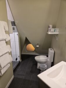 Then we went back to the hotel, checked out, nearly forgot our food (and my shopping bag) in the fridge (but remembered), and hiked to our new hotel. It was a very long walk for me; Google I think said it should take half an hour and I took twice that. Tharash eventually took over dragging both rolly bags. Getting into the hotel door was difficult; it was in a vintage house (I bet a former apartment building?) so there was no lobby, so there was no reception – only a code. Two people consecutively stopped to help us, a gruff old man and a lovely young woman, both of them wished us a Happy New Year. Then it turned out we went in the wrong door anyway, that there were two doors to get in and the other one was closer to our room, and we had to wait in the lounge for like half an hour for the cleaning person to finish cleaning our room. (as an aside, there were two Japanese women eating dinner there, they had take-out and said “Itadakimasu”, I don’t often hear Japanese spoken in the wild so that was interesting to me.) I said to Tharash “Next time pretend not to be Dutch for 15 seconds and let me book the modern expensive [Best Western] hotel.”