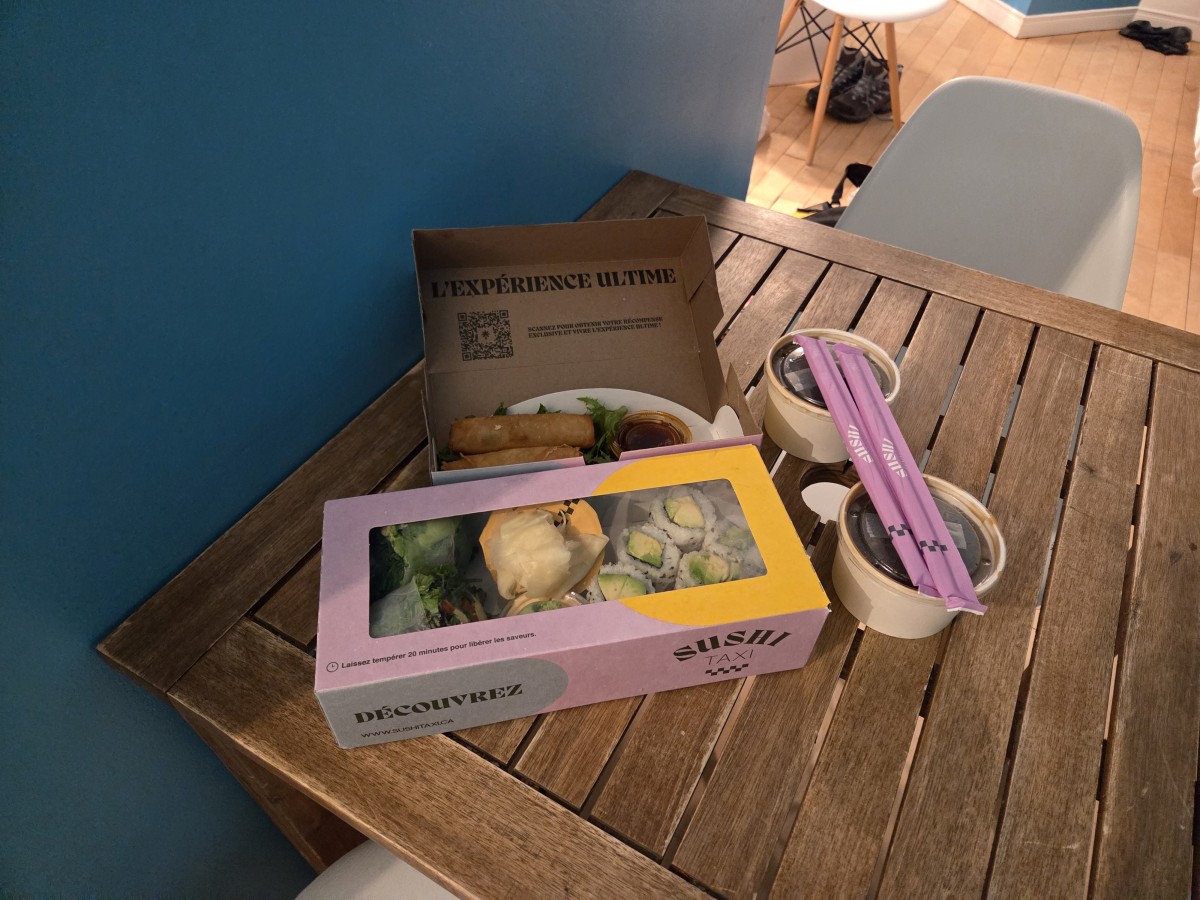 Tharash looked for take-out options online and found a sushi place. I had a shower and it was WONDERFUL, the best shower of the whole trip (but the sushi confirmation email said they would need the credit card holder to show ID and I hoped that when he went to pick it up they wouldn’t make me come down too because I washed my hair and it would freeze out there, but they didn’t ask him about it). We each got a miso soup that… turned out to have deep-fried tofu in it? Weird, and it also had a strangely rich spicy flavour. I also got a 6-piece avocado roll. Tharash had a veggie spring roll, which was more like a wrap in rice paper, and also some ‘Imperial rolls’ which were more like what I think of as spring rolls.