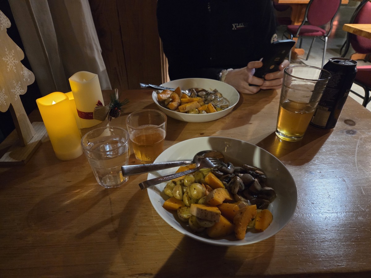 For dinner Tharash made a tofu stirfry. And I’m going to complain again about the hostel here; one of the things that really bothered me about it was that although there was a shoe rack near the front door, no one takes their dirty snowy boots off when coming inside so they tromp dirty ice water all over every floor. Tharash had brought slippers so his feet were okay (although he’s going to have to wash his slippers thoroughly) but I ended up using my fluffiest socks for it – the ones that feel like shag carpet inside. I’ve put them through the wash since I got home, but I’m going to put them through the wash again, poor things got rather abused.