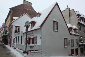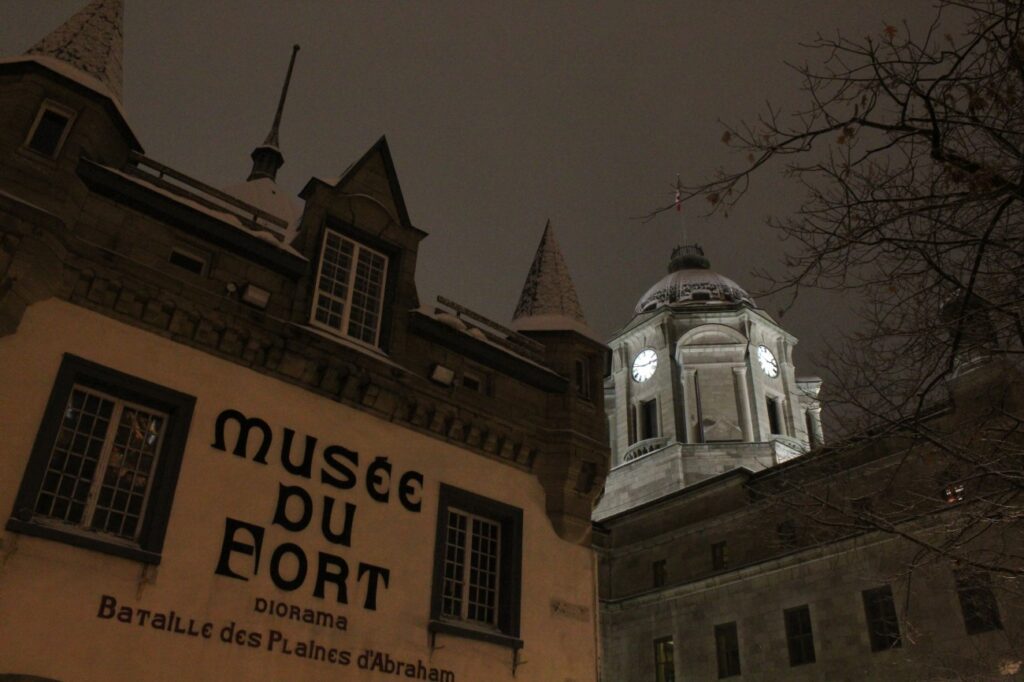 After lunch (the other half of the bagel with some hummus) I wanted to go out and see the museum at the Plains of Abraham. It was a bit of a hike in my condition, but we made it and were greeted by a lady in period costume. I had to rest a bit (and my glasses were really fogged – I swear there was ice in my eyelashes by the time we made it) so it was nice that the English video explaining Montcalm/Wolfe was just starting. Then we went to the third floor for the related exhibit, where a guy in period costume directed us to the beginning of the exhibit (because the elevator does not take us there). They had some examples of uniforms, and an entire 6-pounder cannon just like the two that Wolfe had hauled up the cliffs to help in the battle (very impressive that they got them up there). I chatted with the guy a little about his outfit, he explained that the common soldiers had to carry swords as part of the uniform but they were really cheap crappy swords so they didn’t get used in actual battle.